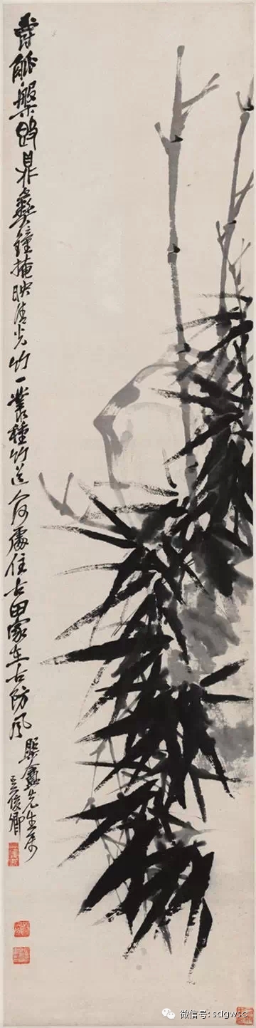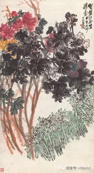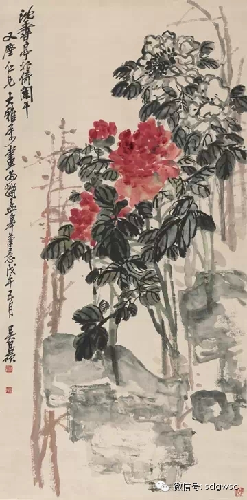 与其他文人画家相比,吴昌硕绘画的另一特点是常常描绘牡丹。在传统的文人画中,梅兰竹菊是主要的描绘对象,因为它们是文人们清高气节的表征,而牡丹的象征寓意则是富贵,是世俗。但吴昌硕所画的牡丹,又与别人画的牡丹不同,它也具有文人画的特点。吴昌硕在金碧辉煌、光彩夺目的牡丹旁边,往往画上梅兰竹菊,或是画几块顽石,这就使整个画面,有了新的品味。《牡丹水仙图》的中央,是一块圆石,把图分成上下两部分。上部是色彩艳丽的牡丹,下部是色彩淡雅的兰花。这幅作品粗粗一看,以为是表现牡丹,歌颂牡丹,但是,细读画作的题诗,就知道艺术家的良苦用心,在吴昌硕表现红牡丹的作品中,有两个对立的因素构成:一个因素是兰梅竹菊,它们代表雅;另一个因素是色彩艳丽的牡丹,它代表俗。因此,这就使吴昌硕的作品有了一个重要的特点,即雅俗共赏,这也使中国传统的文人画走出清高孤高的文人艺术挟制,开始为普通大众所欣赏和接受。