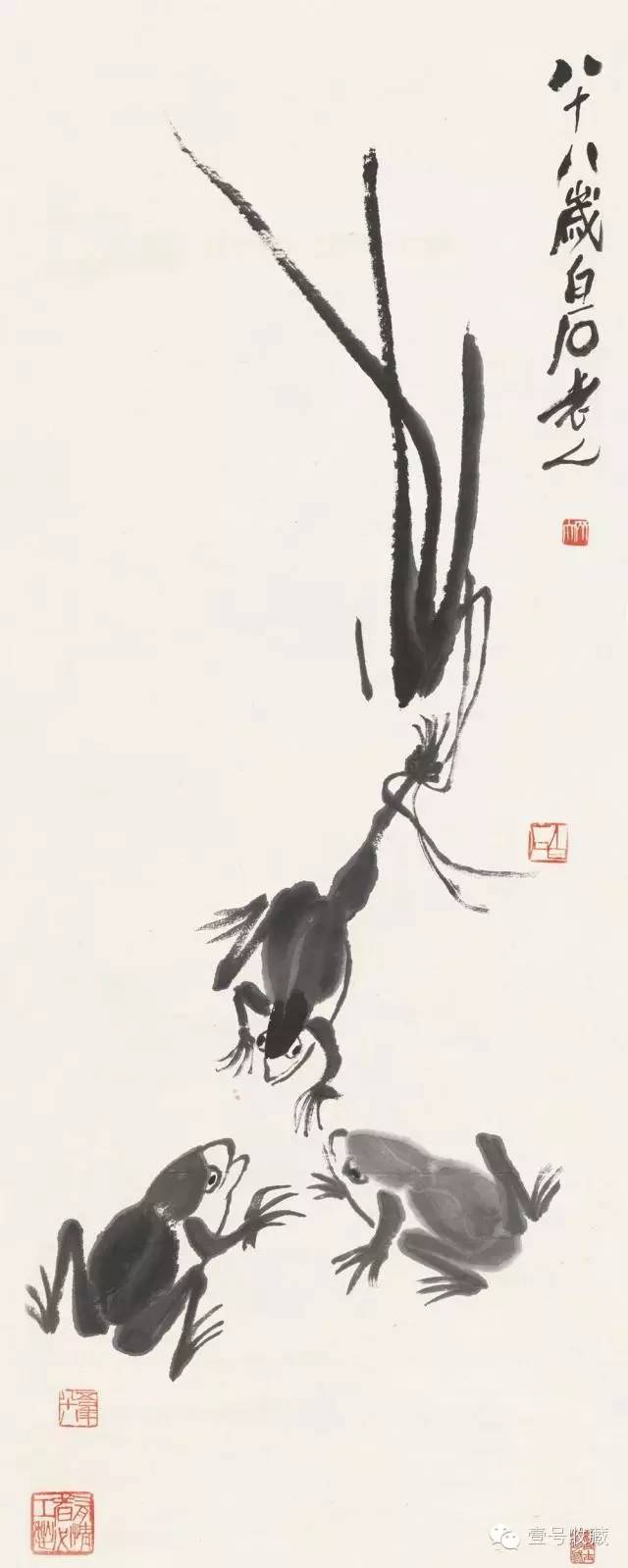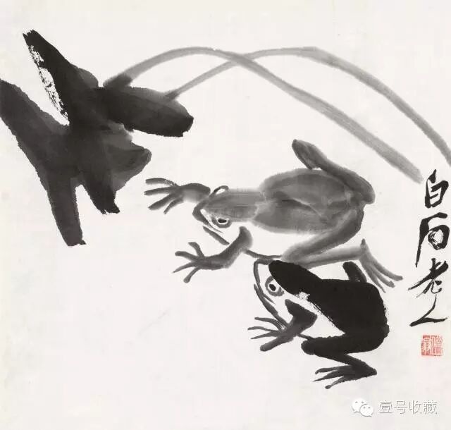 诸多只有下层平民才耳熟能详的物象,从来都不能登传统绘画大雅之堂的,都被齐白石一一摄入他的意象与笔底,并赋予其一种新鲜和泼辣的审美价值,如农民日常生活中常用常见的笊篱、柴耙、稻草垛等等,而鱼、虾、蟹、蛙, 在齐白石作品中出现最多。